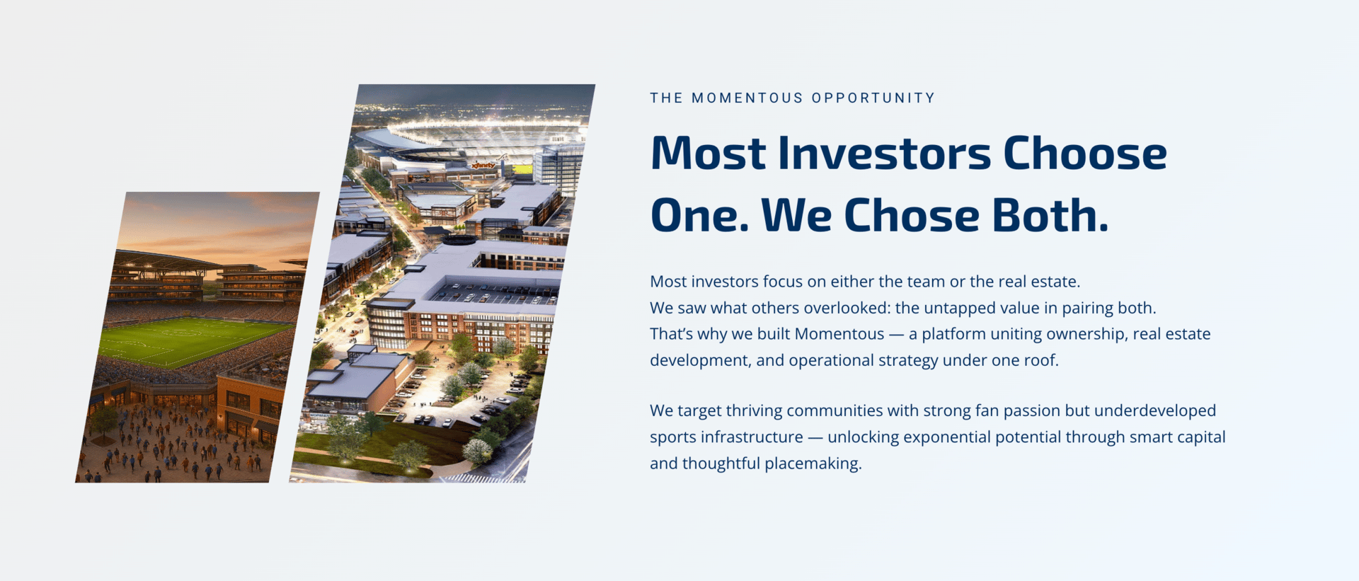 You participate with a sports‑anchored real estate platform developing several mixed‑use districts — each integrating professional sports venues with residential, retail, hospitality, and entertainment components.